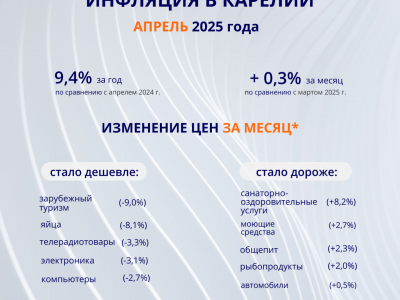 В республике темпы роста цен от месяца к месяцу замедлились. По данным Росстата, в апреле 2025 года цены выросли на 0,25% по сравнению с мартом (месяцем ранее – на 0,83%). Подешевели непродовольственные товары – телерадиотовары, электроника и техника, компьютеры и средства связи. К снижению цен привели охлаждение спроса на эти товары, а также укрепление рубля. Услуги в апреле подорожали умеренно. Цены на отдых в санаториях республики выросли, поскольку увеличилось число бронирований и повысился спрос. Вместе с тем снизились цены на зарубежный отдых, в частности подешевели туры в ОАЭ, Египет, страны Юго-Восточной и Средней Азии, а также Закавказья. Это произошло благодаря укреплению рубля и увеличению количества чартерных авиарейсов. Наиболее заметно в апреле подорожали продукты. Так, из-за снижения объема вылова рыбы в целом по стране выросли цены на рыбные продукты. С наступлением высокого турсезона в республике подорожали услуги общепита. Годовая инфляция в Карелии в апреле замедлила