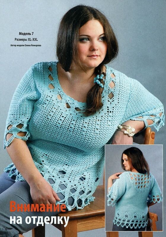 Размер: XL-XXL Вяжите по схеме 1. Наберите цепочку из возд. п. заведомо большей длины, начинайте вязать первый ряд верх от начального ряда, провяжите 6 раппортов рисунка. Далее вяжите по схеме. Закончив кайму, вяжите «галочками» 19 рядов до проймы. Для проймы убавьте по 5 «галочек» и одновременно с этим начинайте вывязывать ажурную вставку по схеме 2. Вяжите аналогично переду до ажурной вставки. Затем вывяжите ажурную вставку по схеме 3. На 26-м ряду «галочек» вязание закончите по схеме. Вяжите по направлению сверху вниз. Начинайте с 12 «галочек» и далее вяжите 25 рядов, прибавляя по 1 «галочке» в каждом 2-м ряду. Закончите вязание рукава каймой по схеме 4. Выполните плечевые швы. Обвяжите вырез горловины столбиками б/н с пико. Вшейте рукава, выполните боковые швы и швы рукавов.