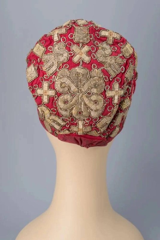 Тафта, кумач, холст, береста, золотные нити, шнурок и тесьма, нитки шерстяные и бумажные, блестки, шитье золотное "по карте", вышивка "крестом"