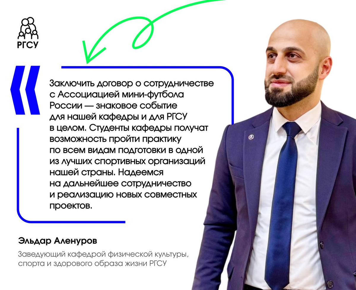 Документ о сотрудничестве подписали заведующий кафедрой РГСУ Эльдар Аленуров и президент АМФР Эмиль Алиев. Теперь студенты Первого Социального смогут проходить практику на мероприятиях АМФР под руководством ведущих специалистов как самой Ассоциации, так и всего российского мини-футбола!