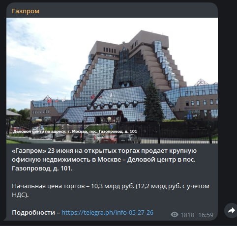 Бюджет Газпрома настолько исхудал, что они уже рекламируют продажу собственного офиса у себя на канале 😂