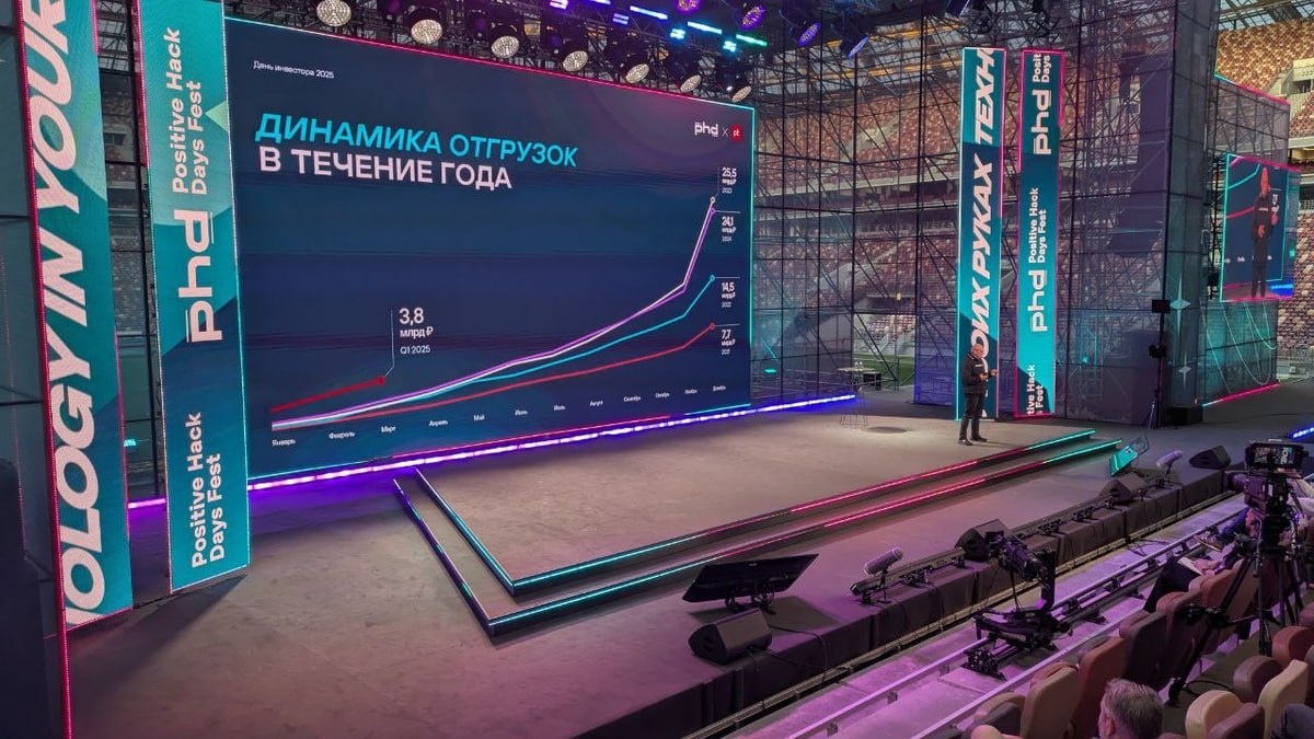 Как прошел День инвестора у Positive Technologies на PHDays 2025? На фоне стремительного развития отрасли кибербезопасности и растущего спроса на технологическую независимость, Positive Technologies провела День инвестора в рамках крупнейшего отраслевого форума страны — фестиваля PHDays, собравшего в 2025 году рекордные 150 000 участников и делегации из 40 стран. А для инвесторов был отдельный день — и это, пожалуй, один из самых насыщенных по количеству анонсов и фактов ивентов от IT-компании в этом году. 👉Какие планы и результаты? Positive Technologies подтвердила прогноз по отгрузкам на 2025 год — от 33 до 38 млрд рублей, что выше прошлогоднего результата (24,1 млрд рублей) и почти в 4 раза больше, чем в 2021 году (7,7 млрд рублей). Уже в первом квартале объем отгрузок составил 3,8 млрд рублей — в два раза выше аналогичного периода 2024 года. Для сравнения: в первом квартале 2024 было 1,8 млрд, в первом квартале 2023 — 1,2 млрд. Рост драйвят сразу несколько направлений: новый пр