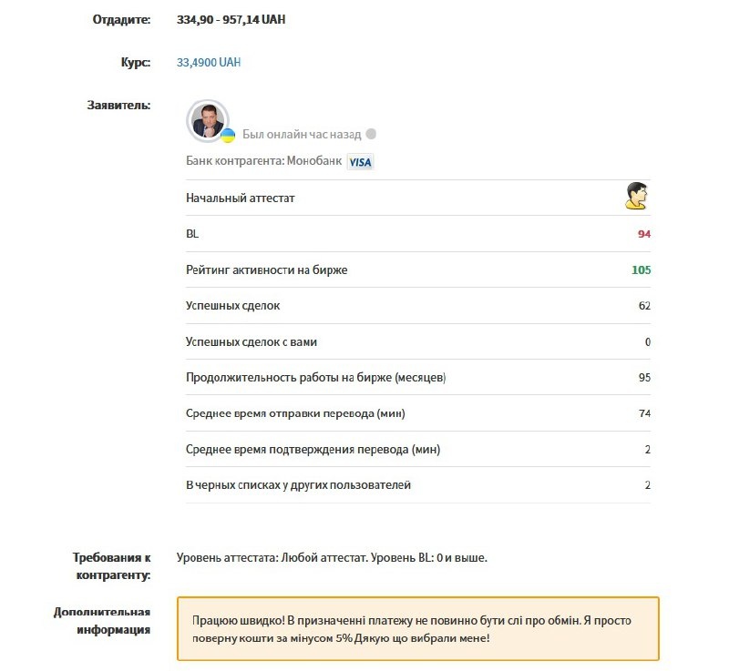 Стоит ли верить тому, что пишут в примечании к ордерам в бирже. Вот например, этот человек пишет, что работает быстро и вернет деньги назад за вычетом 5 процентов, если в комментарии к платежу напишите про обмен. Но если взглянуть на параметры его кармы обменческой, то в среднем ожидать от него денег придется 74 минуты. Вот я бы не стал покупать у такого вмз, раз в комменте дурит, может и во всем остальном надурить