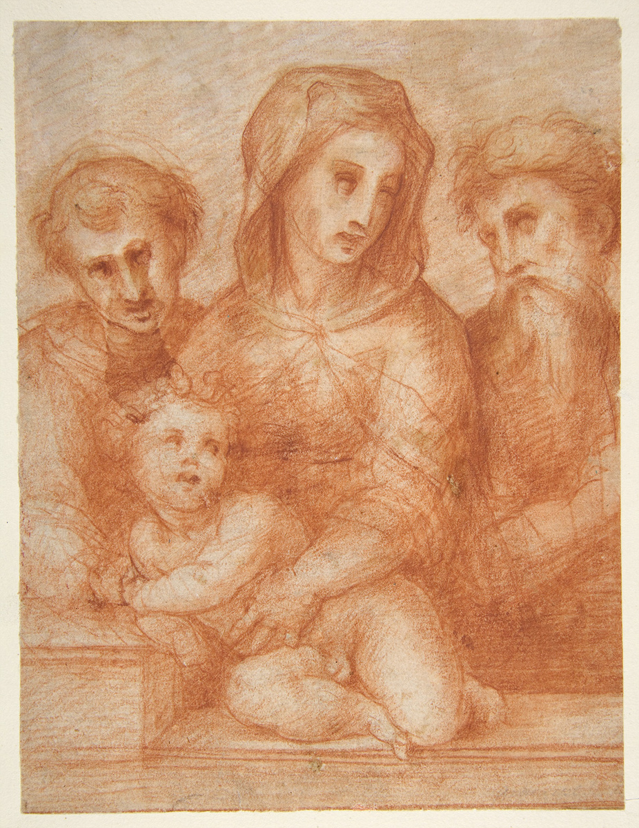 Доменико Пулиго (1492–1527) принадлежал к первому поколению художников-маньеристов Флоренции. На него оказали сильное влияние его близкий друг Андреа дель Сарто (1486–1530), а также молодой Якопо Понтормо (1494–1557). Согласно его биографии в книге написанной Джорджо Вазари, Пулиго имел финансово успешную карьеру художника, писавшего портреты и религиозные картины для флорентийского дворянства. Рассматриваемый нами этюд для картины, ранее находившейся в коллекции Стэнли в Лондоне, не только редок (художнику приписывают менее тридцати рисунков), но и является одной из лучших работ Пулиго. Художник работал с красным мелом с большой выразительностью и технической виртуозностью, быстро обводя контуры фигур кусочком довольно твёрдого мела, а затем снова и снова перерабатывая их, чтобы придать им жизни. Используя мел почти как ручку, он рисовал промежуточные тени смелыми полосами параллельных линий и перекрестной штриховкой, а затем, для получения самых глубоких теней, дополнял их плотными ш