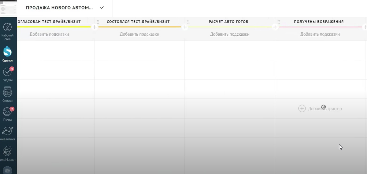 Для начала убедимся, что в нашей воронке продаж автомобиля отсутствует какая-либо автоматизация. На данный момент воронка абсолютно пуста — в ней нет ни одного триггера или бизнес-процесса. Это значит, что все задачи менеджеры выполняют вручную, что занимает много времени и снижает эффективность.