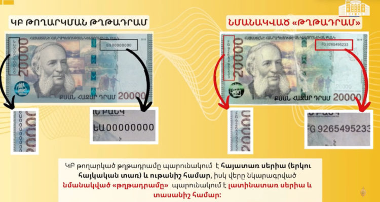 Мошенники начали использовать сувенирные банкноты как настоящие деньги, сообщила Полиция МВД и призвала проверять купюры при денежных операциях. Сувенирные банкноты по размеру, а также по внешнему виду лицевой и оборотной сторон имитируют банкноты нового поколения, выпущенные Центральным банком Армении. По данным полиции, жертвами обмана чаще всего становятся таксисты, курьеры и занимающиеся торговлей лица. Полиция призвала в случае получения оплаты сувенирными банкнотами за какую-либо услугу немедленно сообщить по номеру 102. «Совместными усилиями мы можем если не полностью искоренить, то хотя бы свести к минимуму количество подобных случаев», — говорится в сообщении. МВД предложило несколько способов отличить сувенирные банкноты. Так, изображения на лицевой стороне настоящих купюр рельефные и ощутимы на ощупь, в левой части лицевой стороны имеется участок с оптически переменной краской, которая при изменении угла падения света меняет цвет с зелёного на синий. По всей длине подлинной