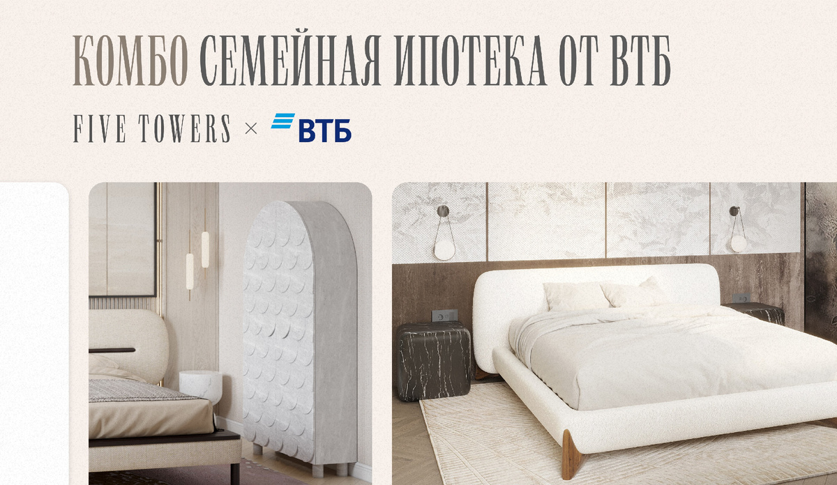 Банк ВТБ, партнёр проекта FIVE TOWERS, предлагает комфортную низкую ставку по семейной ипотеке. Для покупки квартиры в премиальном небоскрёбе на Ленинском можно выбрать одну из действующих программ*: Кредит на покупку квартиры в FIVE TOWERS ведущий банк страны предоставляет без дополнительных затрат за выдачу и оформление сделки. Узнать подробнее об ипотечных программах в ВТБ и сделать расчет *Ставка от 7,73% до 18,30% годовых действует при первоначальном взносе от 20,1% при подтверждении дохода и занятости. Полная стоимость кредита 24,657% – 24,825%. Заемщики — граждане РФ, имеющие детей, являющихся гражданами РФ: одного ребенка в возрасте до 7 лет, двух и более детей в возрасте до 18 лет, либо ребенка-инвалида в возрасте до 18 лет на дату заключения кредитного договора. Для семей с ребенком до 7 лет: Кредит предоставляется на приобретение у юр. лица (в том числе управляющей компании инвестиционного фонда) или ИП - первого собственника - застройщика готового жилого помещения, или н