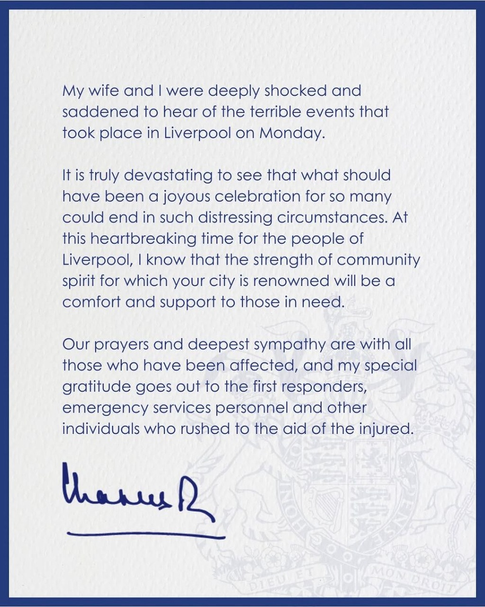 🔴Чарльз и Камилла, Уэльские выразили сочувствие и слова поддержки пострадавшим, а также благодарность работникам срочных служб в связи с произошедшим вчера в Ливерпуле.