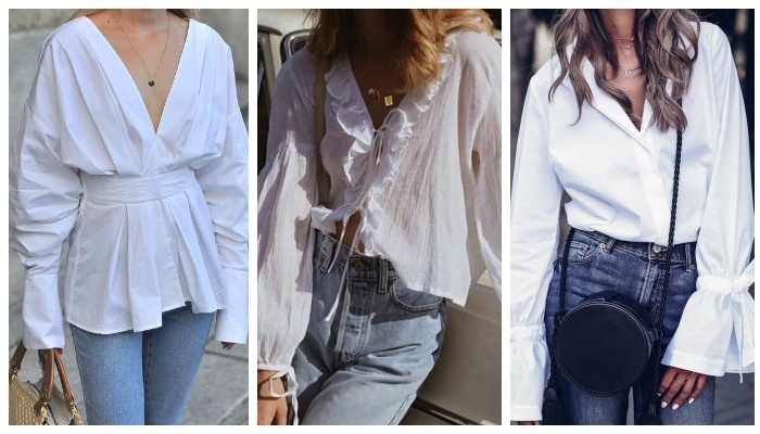 Белая блузка – вечная классика женского гардероба, но даже базовые вещи требуют актуального воплощения. Стилисты советуют освежать этот элемент одежды современными деталями и силуэтами. В нашей подборке – эффектные примеры того, как обыграть белую блузку в ультрамодных образах. Яркий пример минималистичного аутфита – свободная белая рубашка, дополненная темно-синими джинсами. Образ довершают массивные золотистые аксессуары и нюдовый клатч с коротким ремешком, что создает идеальный баланс между лаконичностью и стильной выразительностью. Такой ансамбль выглядит свежо и современно, подчеркивая изысканный вкус своей обладательницы. Запомните этот крой белоснежной блузы, он поможет скорректировать фигуру, скрыть недостатки и подчеркнуть ее достоинства. Глубокое декольте визуально удлиняет шею, акцент на талии делает ее тонкой и изящной, а баска стройнит бедра. Кутюрье продолжают радовать модниц трендовыми блузами с квадратным вырезом в зоне декольте и великолепными акцентными рукавами. Эту