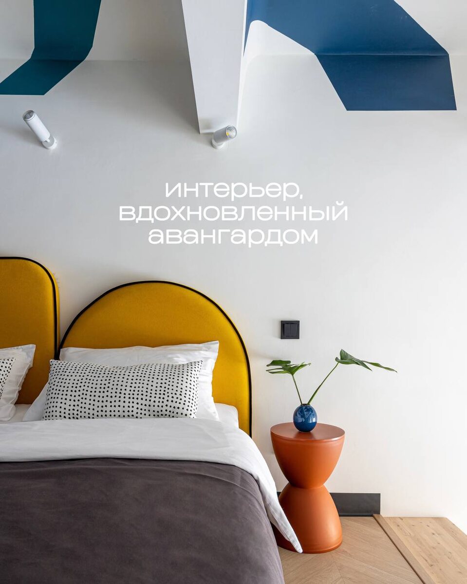Ключевым элементом интерьера стала роспись потолка, выполненная в духе авангардного искусства. Яркие геометрические формы и насыщенные цвета не только привлекают внимание, но и визуально расширяют пространство, создавая ощущение динамики и глубины.