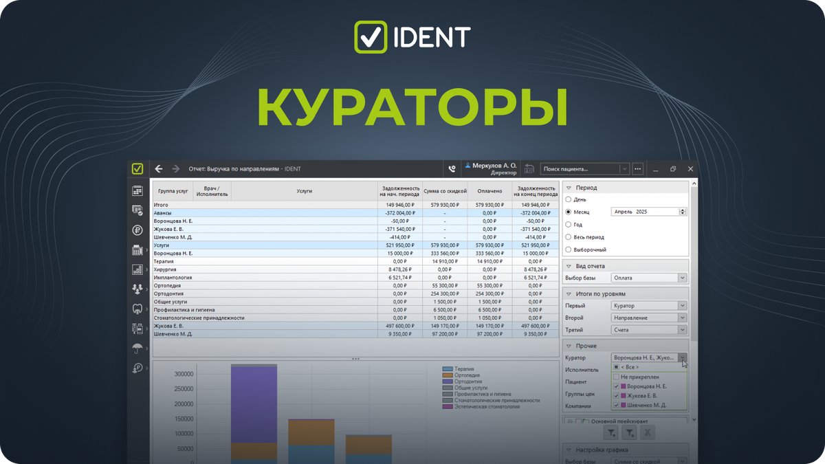 Мы обещали крутые обновления – мы их сделали! В новой версии IDENT 296 появились ключевые возможности для работы с кураторами, чтобы увеличить лояльность ваших пациентов, а работу клиники сделать еще более эффективной📈 Теперь вы сможете назначать сотруднику профессию «Куратор», прикреплять и менять кураторов для пациентов, а также откреплять всех пациентов от сотрудника при необходимости. А с помощью 4 главных инструментов вы сможете проанализировать работу кураторов с пациентами: ✔️ Отследить выручку клиники по каждому куратору в отчете «Выручка по направлениям». ✔️ Оценить результаты работы в отчете «Эффективность планов лечения». Он покажет есть ли у пациентов каждого куратора будущие события: прием, запись в лист ожидания или задача CRM. ✔️ Сравнить выручку у планов лечения с сопровождением куратора и без в отчете «Планы лечения». ✔️ Сегментировать пациентов по различным параметрам и распределять их между кураторами через отчет «Пациенты». В следующих версиях IDENT появятся дополн