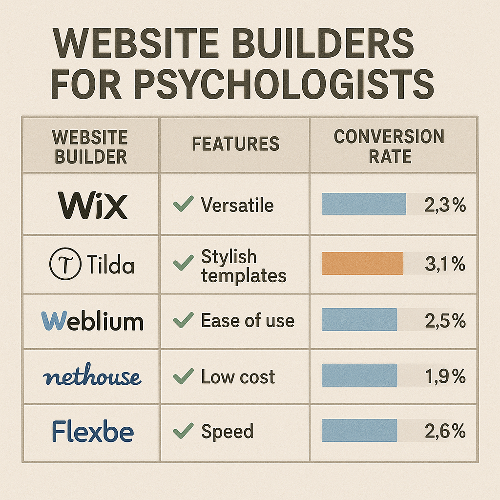 Для VIP-психологов с высоким ценовым сегментом: Webflow или Readymag с кастомным дизайном – премиальная презентация услуг с максимальным акцентом на уникальность подхода.