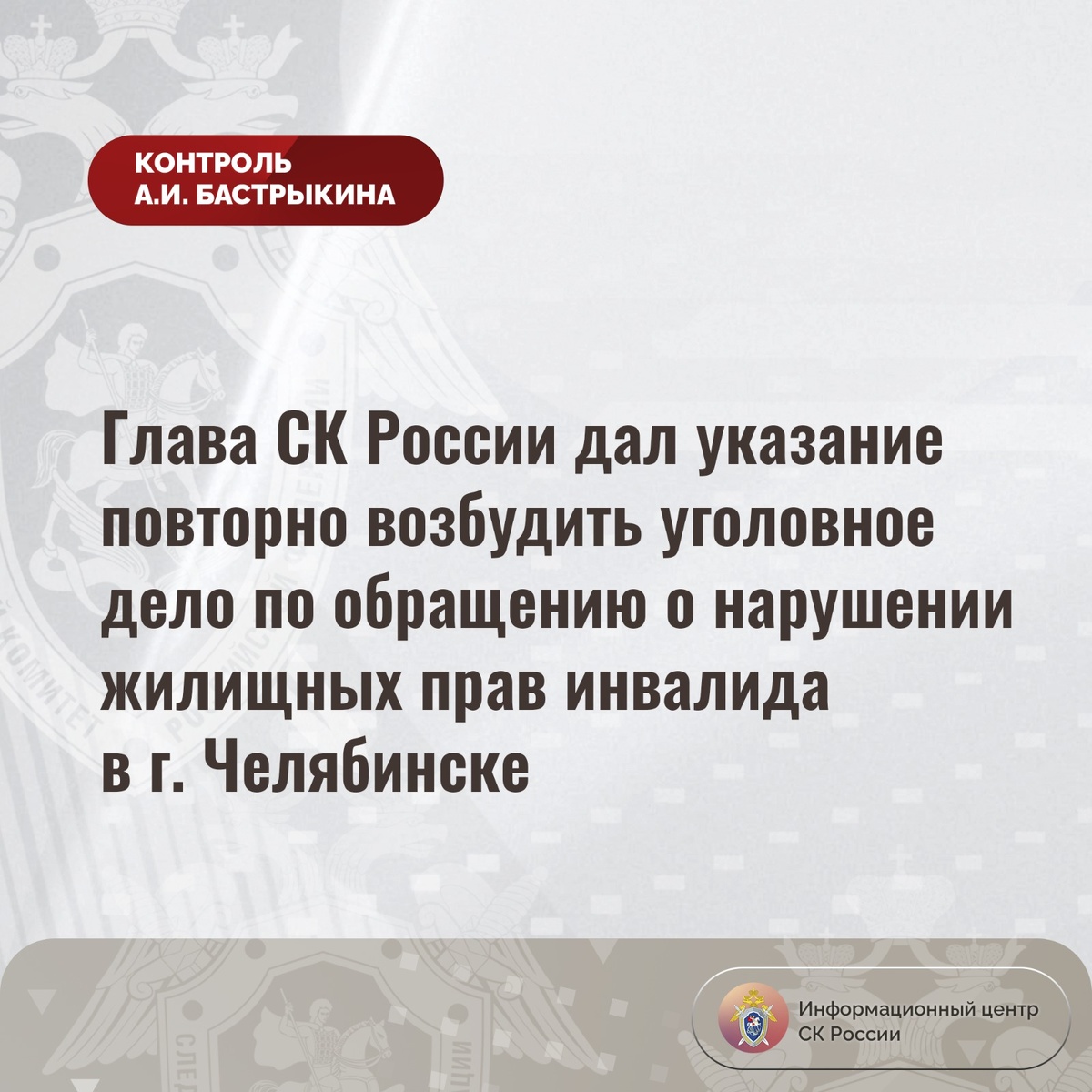 Глава СК России дал указание повторно возбудить уголовное дело по обращению о нарушении жилищных прав инвалида в г. Челябинске