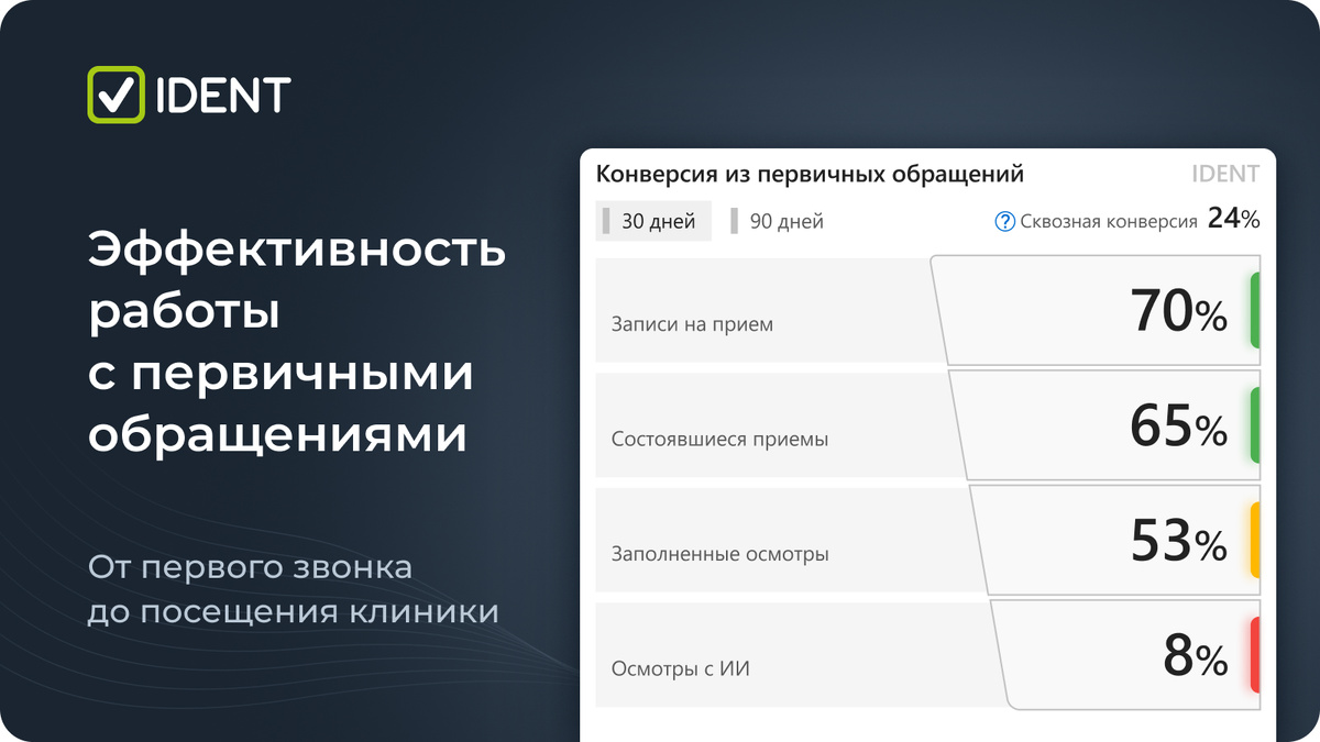 Воронка намного упрощает такие задачи, как: ✅Контроль показателей Вы сможете быстро оценить как сквозную конверсию, так и конверсию на каждом этапе работы с первичными пациентами. А если вам необходимо более детально разобраться в ситуации, то с помощью одного клика по этапу воронки IDENT откроет необходимый отчет.