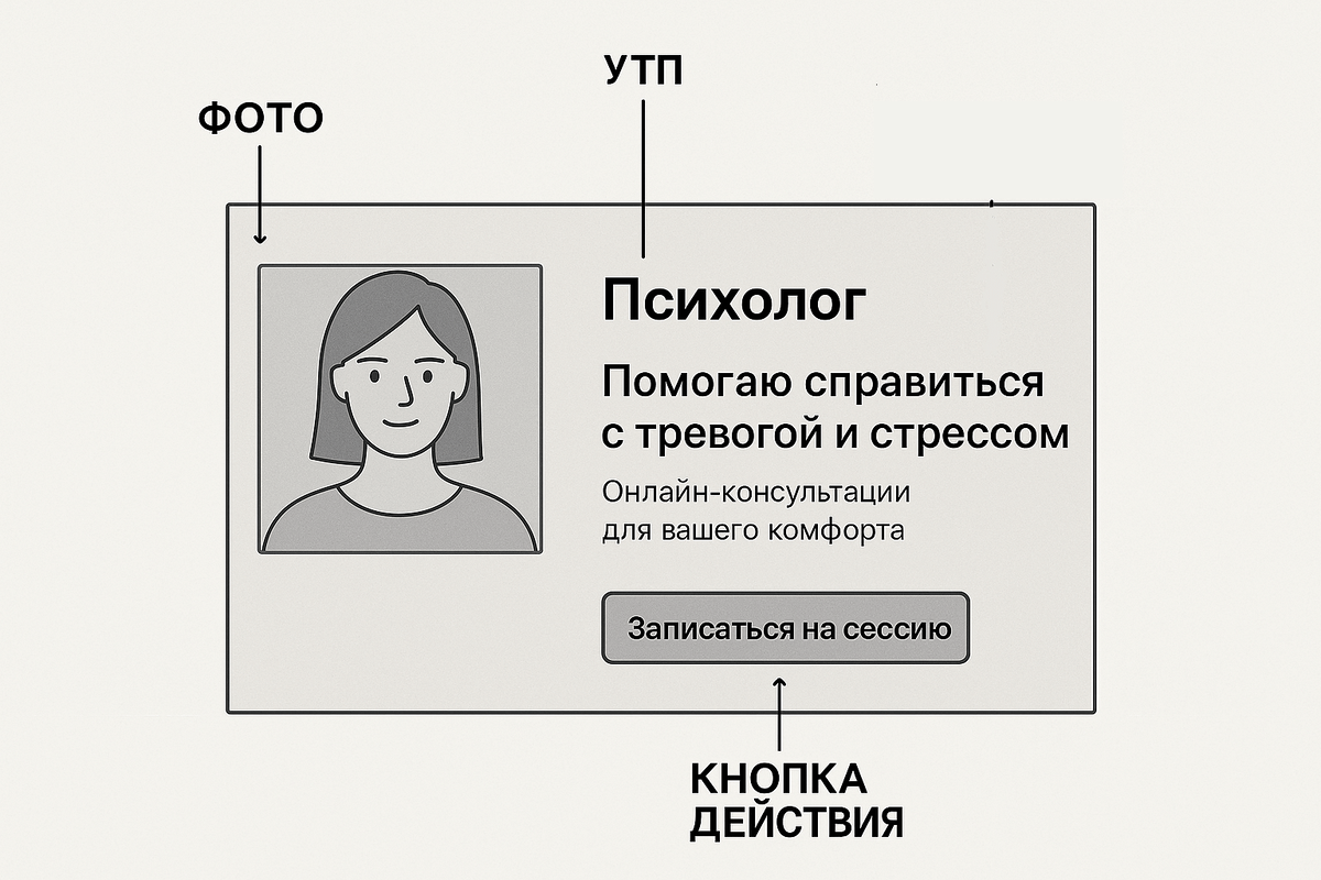 Исследования взаимодействия пользователей с сайтами психологов показывают, что оптимальный первый экран должен содержать: