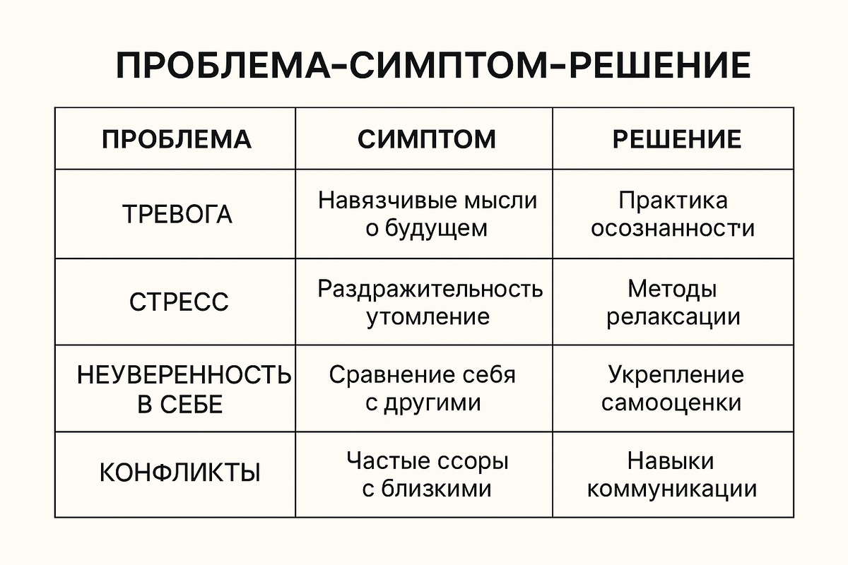 ● По вертикали: основные проблемы (например, тревожное расстройство)