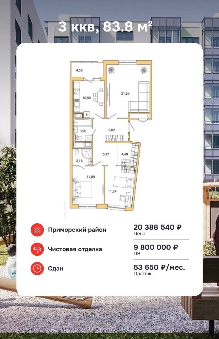 Квартира в ЖК «OKLA», • Кухня-гостиная (больше 21 м²) • Мастер-спальня с отдельным санузлом • Две изолированные спальни • Два отдельных санузла • Продуманные зоны хранения • Чистовая отделка «Скандинавия» Квартира расположена в 8-этажном доме квартала ОКЛА, в популярном среди семей Приморском районе. Отличная инфраструктура — детские сады, школы, магазины, аптеки и кафе рядом, а живописный Новоорловский заказник всего в паре шагов от дома. Расчет по семейной ипотеке: • цена — 20 388 540 ₽ • ПВ — 9 800 000 ₽ • ставка — 4.5% • платеж — 53 650 ₽/мес. За подробностями -пишите в личку😉