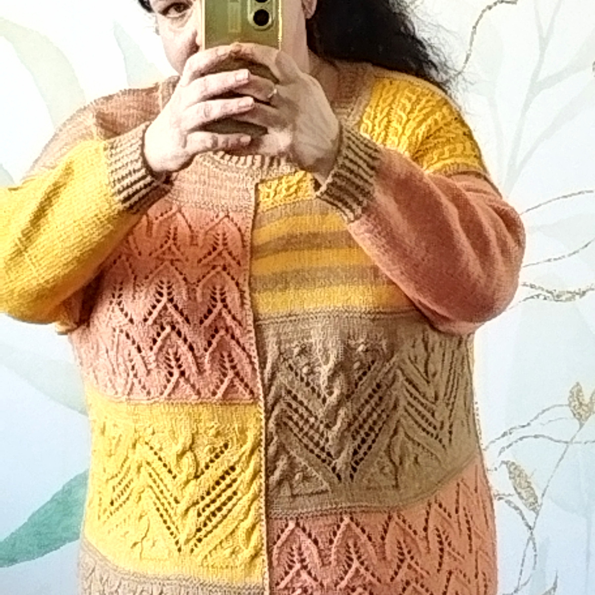Скажу честно, я плохо продумала этот момент. Я вязала все "запчасти" на одном количестве петель, и участки, где я использовала узор с переплетениями сейчас тянет. Это не очень заметно на фото, когда джемпер лежит статично, но при движении мне заметен и даже ощутим физически этот перекос.