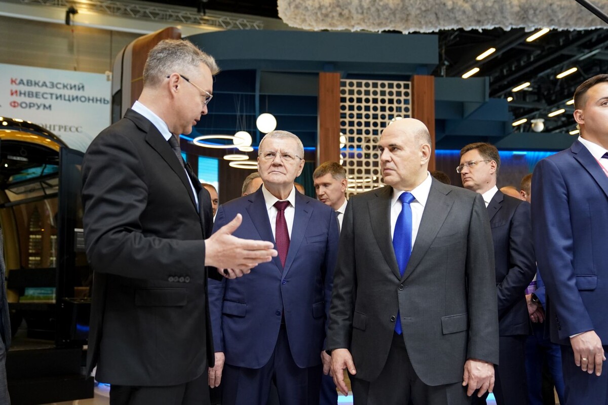 Председатель Правительства РФ Михаил Мишустин,прибывшийна Ставрополье 27 мая, принял участие в работе Кавказского инвестиционного форума. В выставочном центре «Минводы ЭКСПО» глава Кабмина посетил выставку достижений регионов и крупных компаний страны, в том числе стенд Ставропольского рая. Как сообщили в управлении пресс-службы и информполитики ГСК и ПСК, экспозиция нашего региона включает объекты и информацию об АПК, зеленой энергетике, новых направлениях промышленности региона, реализации прорывных проектов и туризме, а также Аллею локальных брендов и продукцию 17 ставропольских предприятий — от питомника плодовых деревьев до производства компьютеров и комплектующих. Губернатор Ставрополья Владимир Владимиров доложил Премьер-министру о том, как идет реализация прорывных проектов. Как было отмечено, за 10 лет реализации прорывные проекты должны принести Ставрополью почти 720 млрд рублей инвестиций и более 38 тысяч рабочих мест с зарплатой выше средней по краю. За 5 лет объем вложений