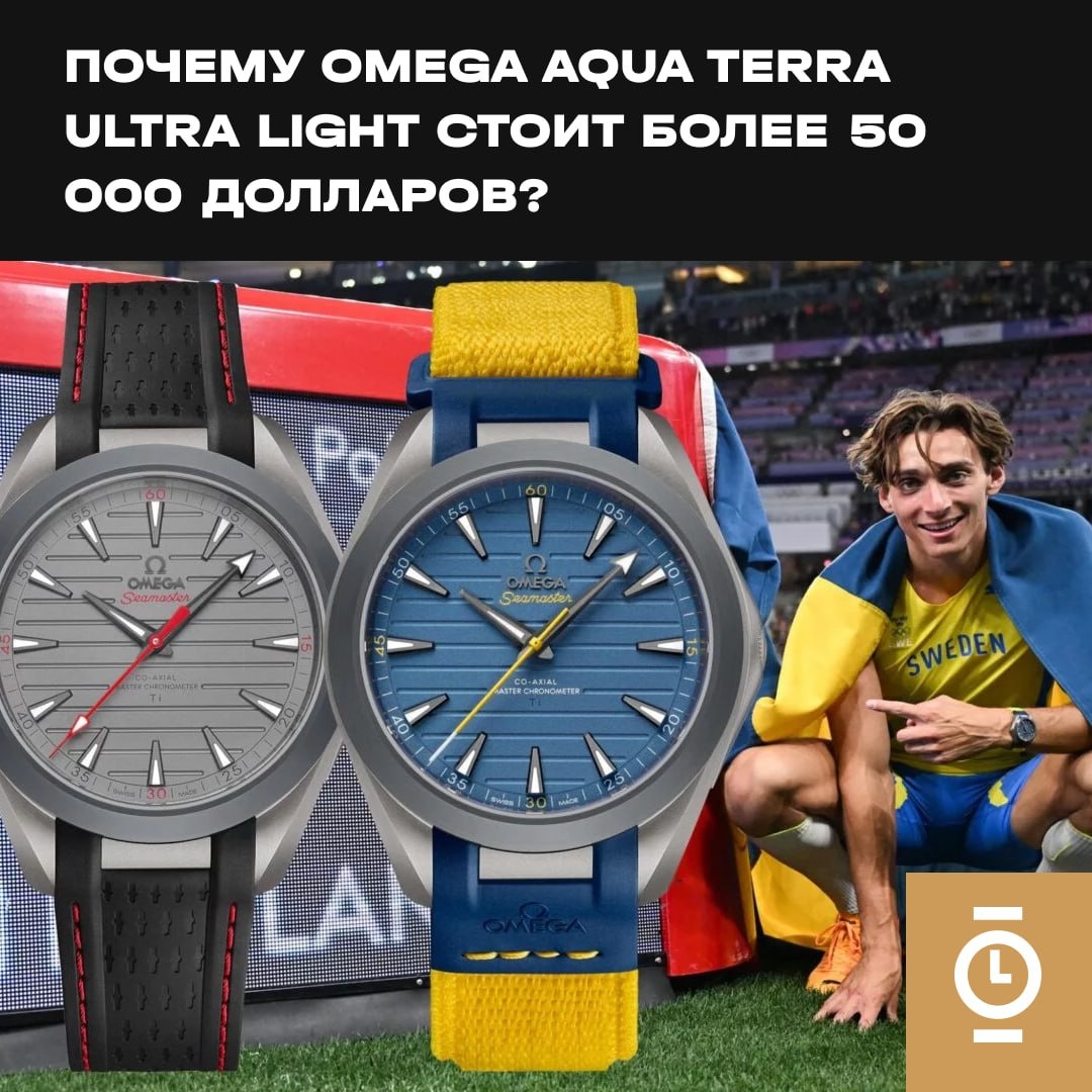 ПОЧЕМУ OMEGA AQUA TERRA ULTRA LIGHT СТОИТ БОЛЕЕ 50 000 ДОЛЛАРОВ? #факты_WD На Олимпиаде 2024 года швед Арман Дюплантис установил очередной мировой рекорд в прыжках с шестом. На его запястье был замечен необычный хронограф — Omega Aqua Terra 150m Ultra Light, созданный специально для него. Эта модель впервые представлена в 2019 году в сотрудничестве с гольфистом Рори Макилроем. Основная цель — часы, которые можно носить во время соревнований. Чтобы добиться минимального веса, компания применила инновационные материалы: корпус изготовлен из сплава титана Gamma Titanium, обычно используемого в аэрокосмической отрасли. Он легче привычного титана grade 5 и устойчив к высоким температурам. Omega — единственный часовой бренд, использующий этот сплав. Механизм — калибр 8928 Ti, основанный на автоматическом 8900, но без ротора автоподзавода (ради снижения веса) и с увеличенным запасом хода на 12 часов. Основная плата и мосты изготовлены из титана с керамическим покрытием, что минимизирует т