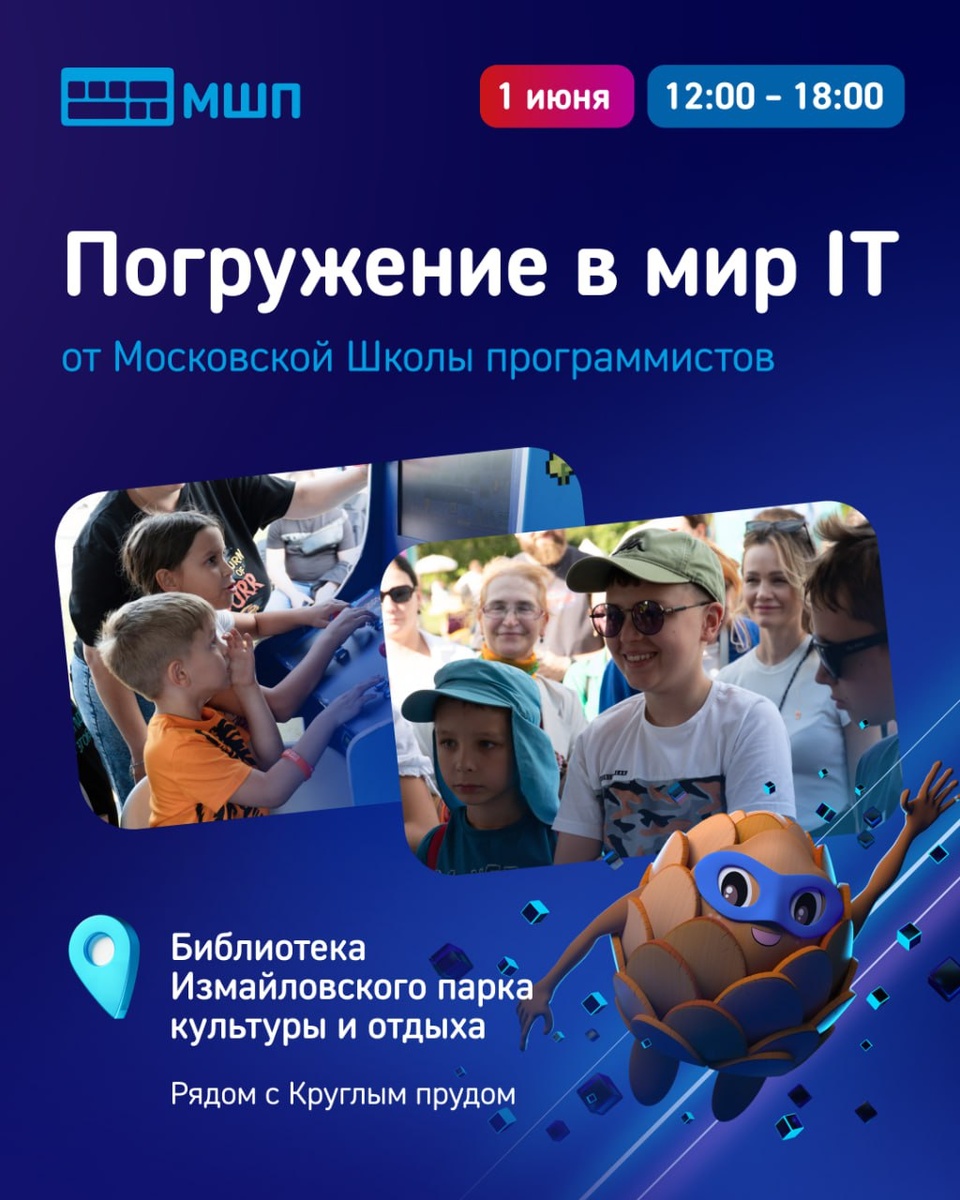✨ День защиты детей с роботами и играми: бесплатный IT-фестиваль от МШП в Измайловском парке — приходите всей семьёй! ✨ ☀️ 1 июня, в День защиты детей, приглашаем школьников 2–10 классов и их родителей на бесплатный IT-фестиваль от Московской школы программистов — день, наполненный технологиями, играми и новыми знаниями! 🗓 Когда: 1 июня с 12:00 до 18:00 📌 Где: Библиотека Измайловского парка (Аллея Большого Круга, 7, рядом с Круглым прудом) На фестивале вас ждут: 🎮 Увлекательные игровые станции • Играем в IT-дженгу с роботизированной рукой • Пробуем себя в гигантском магнитном тетрисе • Погружаемся в мир аркадных ретро-игр ✏️ Интересные мастер-классы • Нейросети (13:00–14:00): учимся использовать ИИ в учёбе и творчестве • Робототехника (14:30–15:30): разбираемся, как устроены современные роботы, и учимся основам инженерии и логики • Кибербезопасность (16:00–17:00): разбираемся, как защитить себя в цифровом мире 💬 Зона общения Обсуждаем IT, находим друзей и единомышленников,