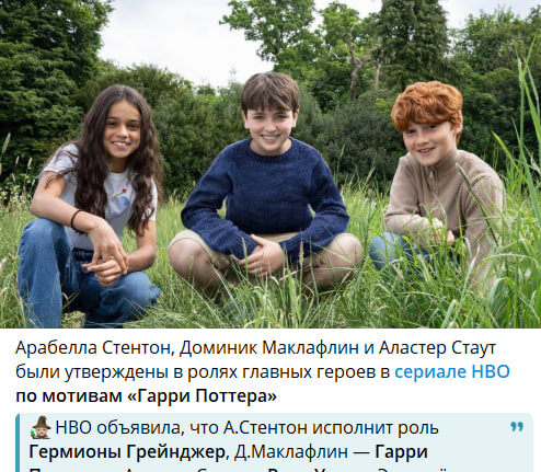Арабелла Стентон, Доминик Маклафлин и Аластер Стаут были утверждены в ролях главных героев в сериале HBOпо мотивам «Гарри Поттера» 🧙🏼HBO объявила, что А.Стентон исполнит роль Гермионы Грейнджер, Д.Маклафлин — Гарри Поттера, а Аластер Стаут — Рона Уизли. Эти актёры были выбраны после масштабного кастинга, в котором участвовало более 30 000 претендентов. 🎥Режиссёры проекта, Франческа Гарднер и Марк Майлод, выразили уверенность в таланте выбранных актёров и с нетерпением ждут их выступлений. 🪄Сериал будет адаптацией всей серии книг Дж. К. Роулинг, с каждым сезоном, посвящённым одному из семи томов. Производство начнётся летом 2025 года, а премьера ожидается в 2027 году.