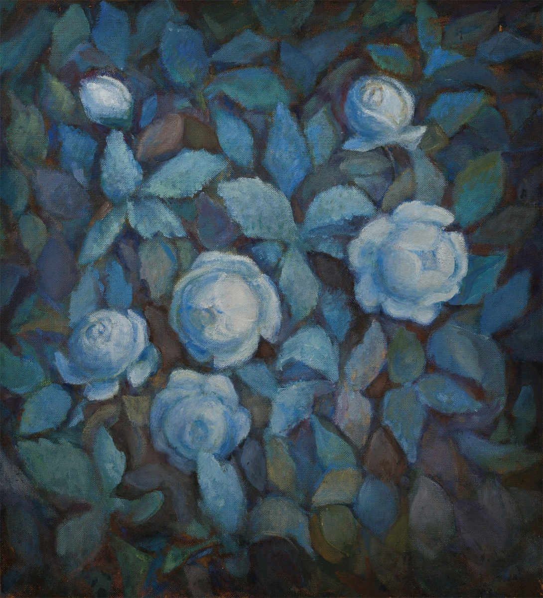 Начав свой путь как портретист, в поздние годы Ольга Потапова все чаще обращалась к беспредметной живописи, стремясь выйти за пределы конкретного образа и приблизиться к сути вещей — к ощущению, вибрации формы. Работа «Без названия» — пример такой живописи, лишенной прямого сюжета, но наполненной глубоким медитативным звучанием. Белые розы здесь не символ, а скорее мираж света на плотной, живой поверхности темных листьев. Они как будто всплывают из глубины холста, растворяются и снова появляются — в этом их поэтика и почти музыкальное движение.