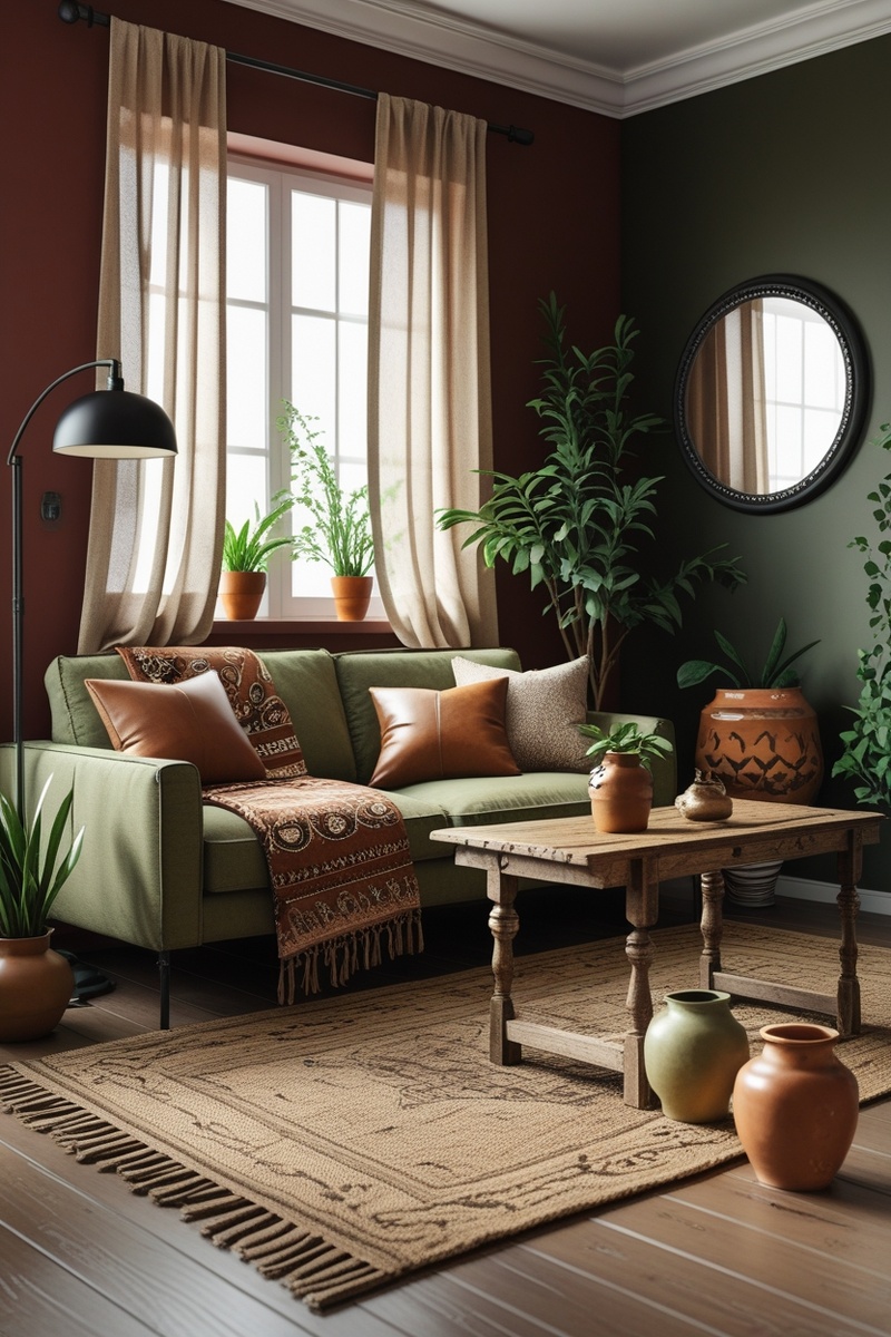 Суккуленты в глиняных горшочках, пышные папоротники в плетеных корзинах, вьющиеся растения на самодельных поддержках – все это создает атмосферу живого, дышащего пространства.