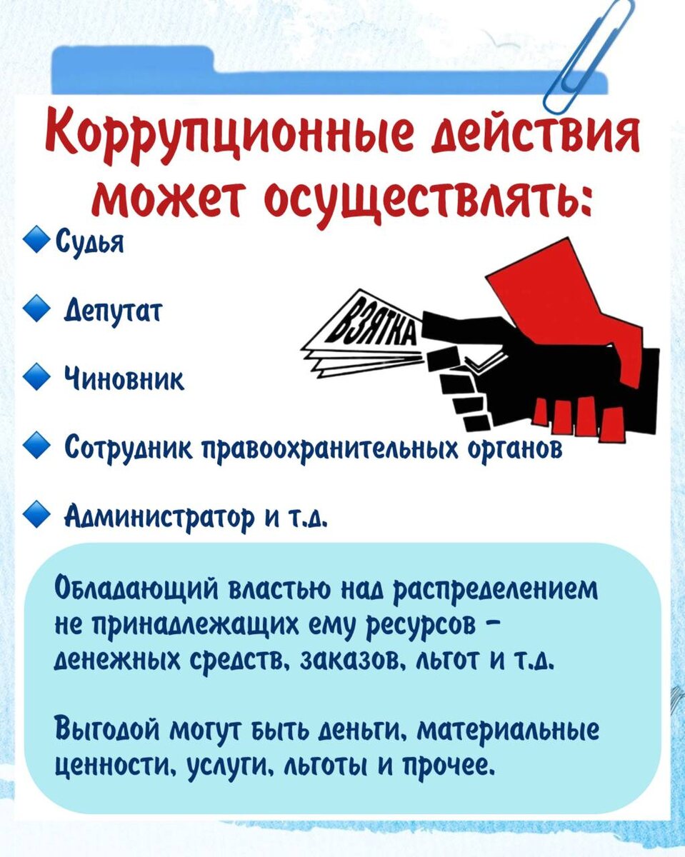 📌Коррупция – незаконное использование человеком полномочий, связанных с его должностью, служебным положением, в целях личного обогащения и получения незаконной выгоды для себя и других.