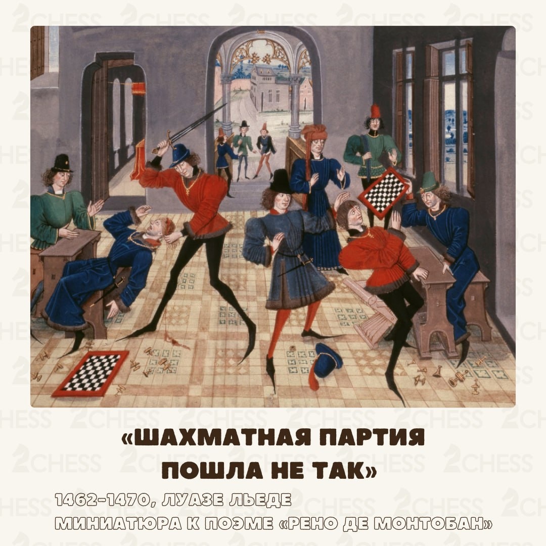 Шахматная партия пошла не так... В эпоху Средневековья шахматы уже были не просто игрой для развлечения, но и символом интеллектуальной и стратегической сноровки. Фламандский миниатюрист Луазе Льеде через свои работы показал потенциальную опасность этого занятия. На одной из иллюстраций к героической поэме «Рено де Монтобан» изображён эпизод, где шахматная партия заканчивается трагедией: один из игроков наносит противнику удар шахматной доской по голове 👊 Эта сцена доказывает, что даже такие интеллектуальные игры могут перерасти в смертоносную схватку. Убийство из-за шахматной партии стало катализатором серьёзного конфликта, который впоследствии перерос в долгую борьбу между императором Карлом и его вассалами