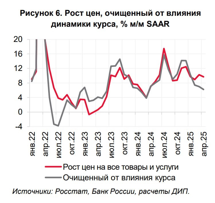 🏦 Рост цен существенно замедлился, — обзор Банка России Замедление зафиксировано в апреле и продолжилось в мае. Замедление темпов спроса становится все более отчетливым. Преимущественно снизились показатели устойчивого инфляционного давления. Значительную роль сыграло укрепление рубля, в том числе благодаря жесткой ДКП. Ожидания по ключевой ставке продолжают снижаться, но требуется поддерживать жесткую ДКП для замедления инфляции. Для достижения цели по годовой инфляции в 2026 году необходимо, чтобы текущие темпы роста цен — как общие, так и устойчивые — снизились до 4% в пересчете на год уже к концу 2025 года. #Инфляция @if_news