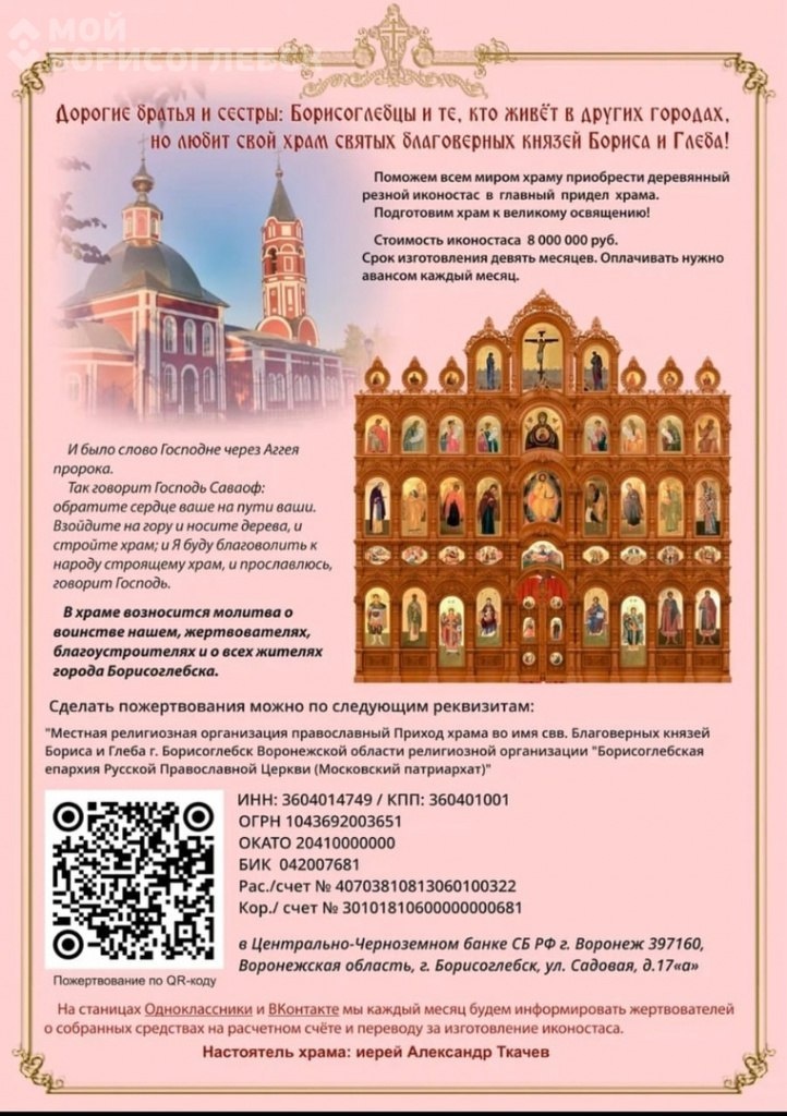 Храм святых покровителей Борисоглебска обратился к прихожанам за помощью Храм святых благоверных князей страстотерпцев Бориса и Глеба обратился к борисоглебцам с просьбой о материальной помощи для оплаты изготовления иконостаса. Общая стоимость работ составляет порядка 8 млн рублей. Храму и Борисоглебской епархии уже удалось набрать на эти цели чуть менее 5 миллионов. Но требуется еще порядка трех. Средства на иконостас для храма можно перевести по QR-коду. 24 мая к борисоглебцам с просьбой о помощи храму святых покровителей Борисоглебска уже обращался главный редактор «Блокнот Борисоглебск» Вячеслав Владимиров. И многие жители города откликнулись на призыв, собрав за сутки более 40 тысяч рублей. Но этих средств недостаточно. Обращаемся с призывом ко всем борисоглебцам, ныне живущим в родном городе или покинувшим его по каким-то причинам с призывом о поддержке Храма!