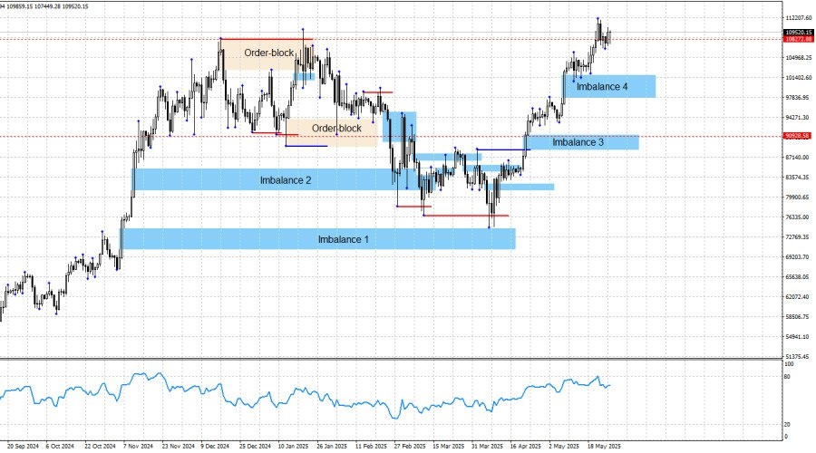 Добрый день, уважаемые трейдеры! Биткоин продолжает формирование «бычьей» структуры тренда и продолжает процесс роста практически каждый день. Можно спорить о том, есть ли основания для формирования нового «бычьего» тренда в данное время, однако графическая картина указывает только на это. Безальтернативно. Так как в данное время продолжает формирование волна вверх, трейдерам остается только ждать цену в зонах интереса для себя, чтобы иметь возможность открыть покупки. Такими зонами выступают только имбалансы 3 и 4.