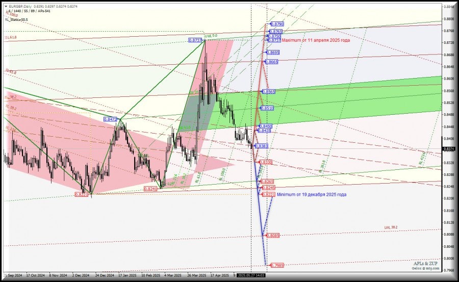Движение EUR/GBP-Daily с 28 мая 2025 года станет проистекать в зависимости от отработки и направления пробоя границ канала 1/2 Median Line (0.8330 – 0.8383 – 0.8435) вил старшего операционного масштаба Minor-Daily..