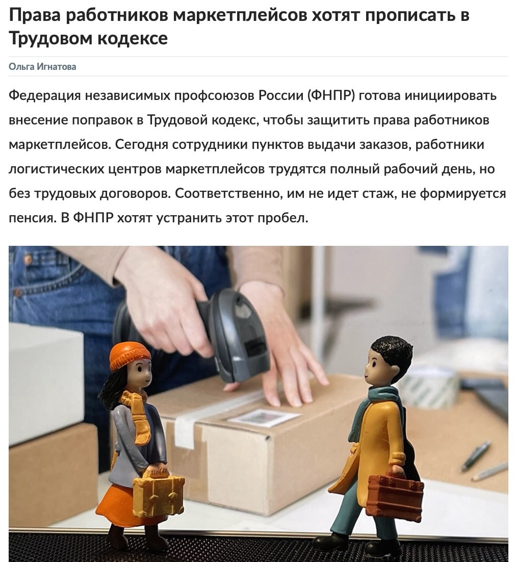 Права работников маркетплейсов хотят закрепить в Трудовом кодексе Инициатива исходит от Федерации независимых профсоюзов России. Проблема знакомая: сотрудники пунктов выдачи, складов зачастую работают полный день, но без официальных трудовых договоров. А это значит – ни стажа, ни отчислений в пенсионный фонд. Учитывая, что к концу этого года в секторе может быть занято около 10 миллионов человек, а к 2030-му и все 20, вопрос стоит остро. Эксперты поддерживают, но тонко намекают на необходимость диалога с самими маркетплейсами при разработке поправок. С этим сложно не согласиться 😁 Но, жёсткие рамки Трудового кодекса, изначально рассчитанного на более традиционные формы занятости. Получается опять, как с ИИ, законодательство пытается догнать стремительно меняющуюся экономическую реальность? 🤨