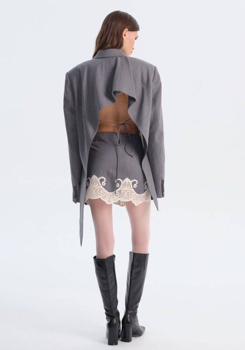 Формально Walk of Shame создали оверсайз-пиджак из серой костюмной ткани с четкой линией плеч и строгими лацканами