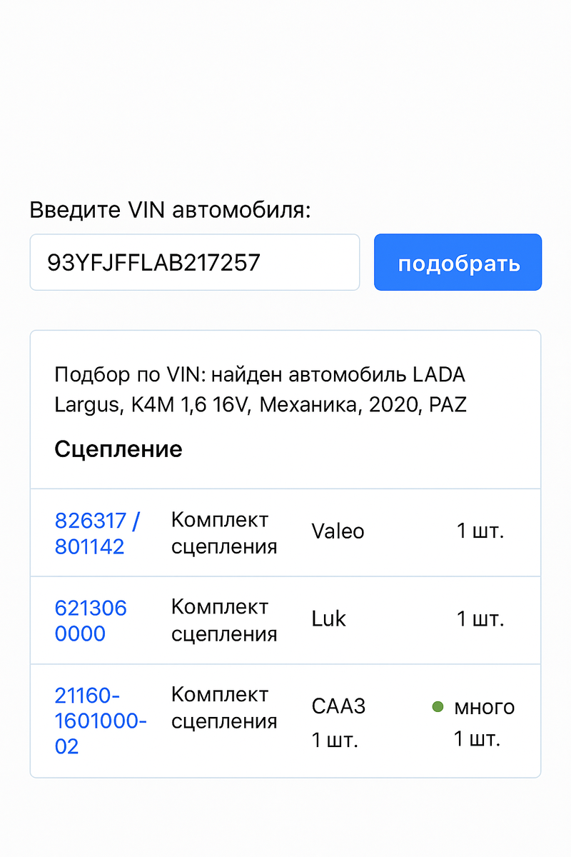 Когда приходит время менять сцепление на LADA Largus, у владельцев возникает главный вопрос: какое именно сцепление установлено на моём авто? Ведь от этого зависит выбор детали, цена и время ремонта. Рассказываем, как быстро и точно определить нужную модель сцепления. Каждому автомобилю при производстве присваивается VIN-код. По нему можно узнать всё о комплектации, включая сцепление. 🔍 Как это сделать: 📌 Подсказка: если сцепление ещё не менялось, вы получите точную информацию об установленной модели. Разные моторы — разные сцепления. Вот краткая таблица, которая поможет: 📌 Если у вас Largus с двигателем ВАЗ и он выпущен после 2021 года — скорее всего стоит сцепление от СААЗа. Если сцепление уже меняли — проще всего посмотреть маркировку на самой детали. Правда, для этого придётся снимать коробку передач. 🛠 Что искать: Если вы обслуживали автомобиль у официального дилера или на СТО — проверьте: 👀 Возможно, сцепление уже менялось, и вы узнаете точный артикул установленной детали