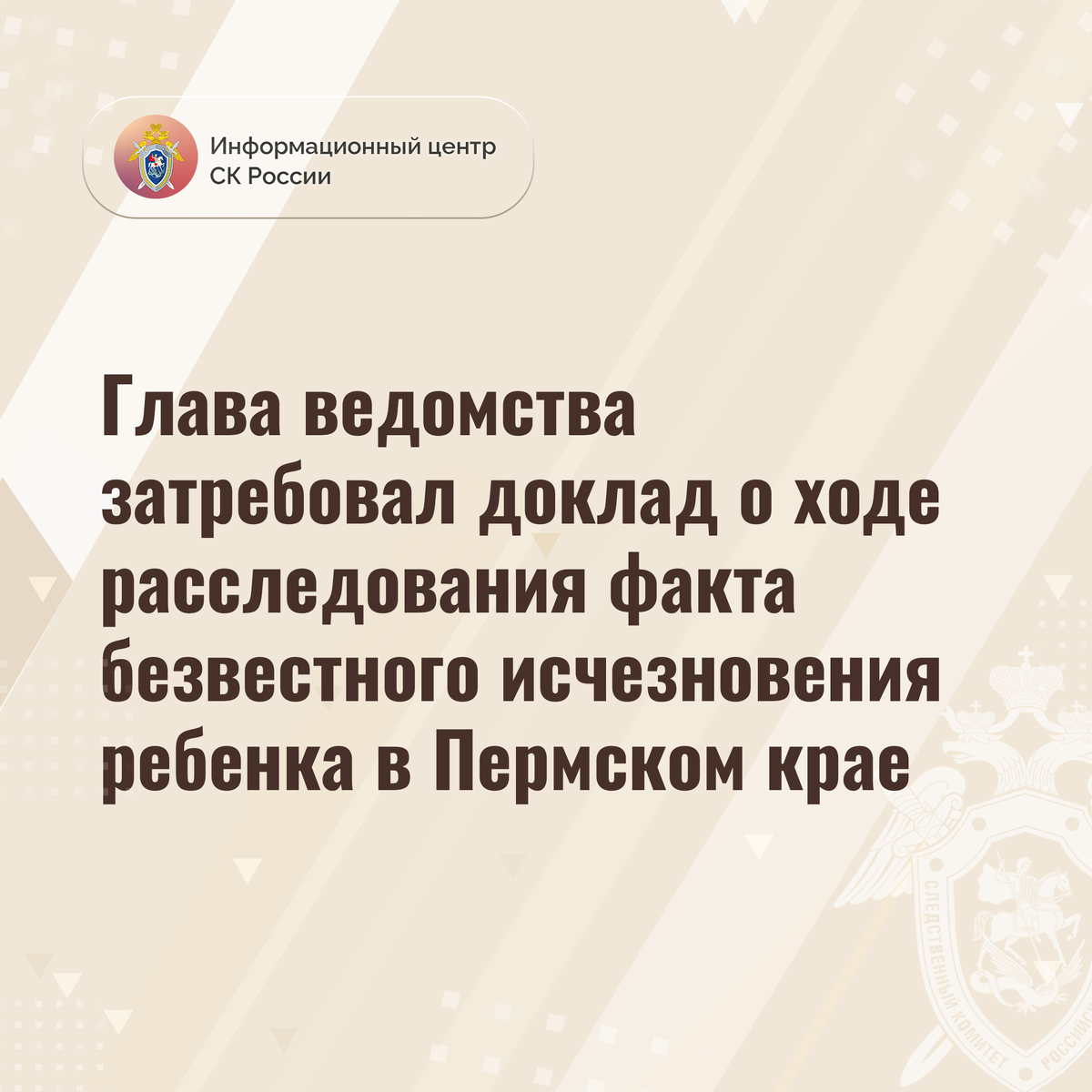 Председатель СК России дал поручение руководителю СУ СК России по Пермскому краю Головкину Д.В. доложить о ходе расследования уголовного дела, а также причинах и условиях исчезновения ребенка.
