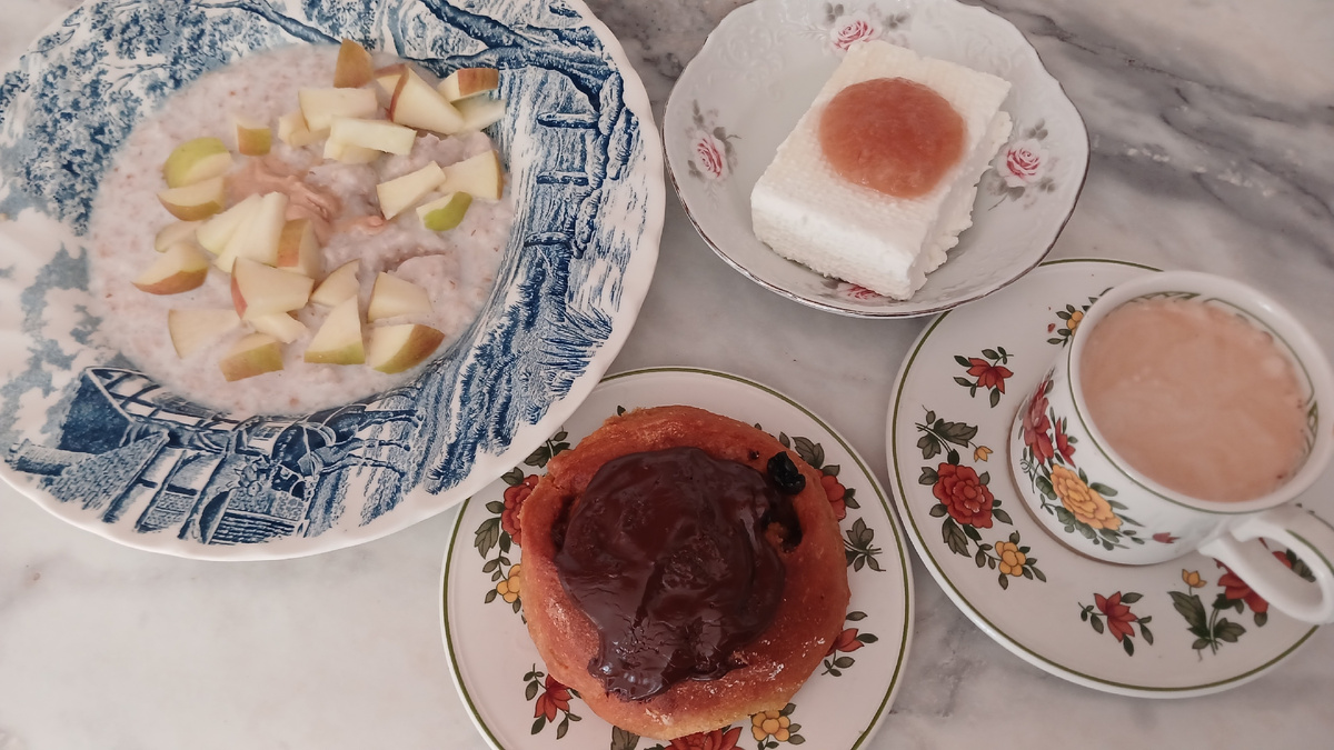 Завтрак сегодня ровно такой же, как и вчера: овсянка и творог. Овсянка с арахисовой пастой и яблоком и творог с персиковым джемом. А к кофе - тыквенная булочка с изюмом и шоколадом На обед яичница с овощами и кофе с булочкой Полдник: абрикосы, кофе и конфета. Абрикосы выглядят лучше, чем на вкус На ужин нам с мужем треска, сыну - котлеты. У меня на гарнир брокколи, у остальных - бурый рис. Пекла сегодня мужу торт на день рождения. Заодно испекла хлеб, запекла треску с брокколи и котлеты. Треска из Вкусвилла - отличная, воды не было вообще при запекании и разморозке 👌 Меню год назад Кроме выпечки торта сегодня еще сварила говядину и овощи на оливье и порезала. Не стала пока только огурцы резать в салат. Есть его нам все равно только завтра вечером.