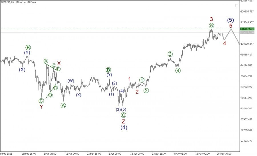 https://basechop.ru/wordpress/?p=44411 В глобальной перспективе по Биткоину может формироваться крупный бычий импульс (1)-(2)-(3)-(4)-(5). Скорее всего, первые четыре части импульсного паттерна полностью завершены. То есть имеются в виду волны (1)-(2)-(3)-(4). Коррекционная волна (4) приняла сложную форму тройного зигзага. На последнем участке графика мы можем наблюдать построение восходящей заключительной импульсной волны 5, которая будет состоять из подволн 1-2-3-4-5. На текущий момент полностью завершенными смотрятся первые четыре небольшие подволны 1-2-3-4. Не так давно могла завершиться стремительная импульсная волна 3, состоящая из подволн [1]-[2]-[3]-[4]-[5]. Сейчас цена может корректироваться в рамках повдолны 4. Скорее всего, указанная коррекция вскоре будет завершена, а значит цена вновь полетит вверх в рамках финальной подволны 5. Большая вероятность, что быки отправятся к предыдущему максимуму 112039.75, который отметила подволна 3. В текущей ситуации можно рассматривать