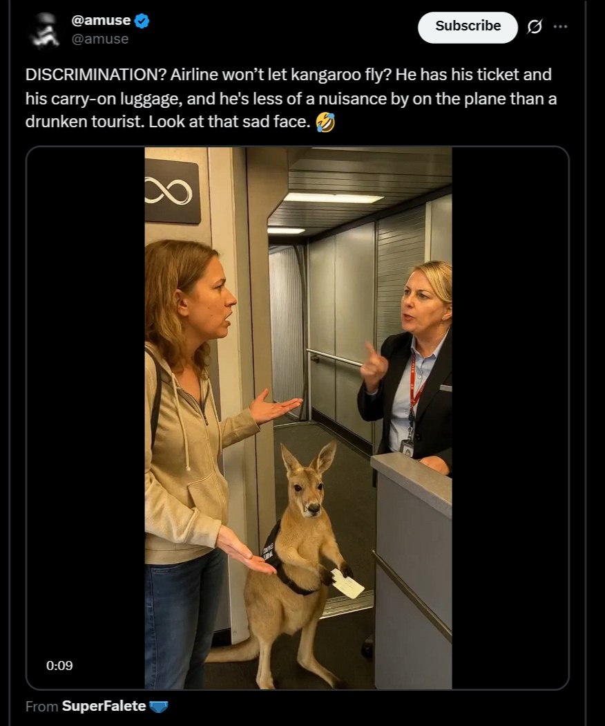 В X «завирусился» ролик с кенгурёнком, который стоял с билетом в лапах и ждал, пока хозяйку пустят с ним на борт самолёта. Он набрал больше 6 млн просмотров за день. Не все пользователи поняли, что это генерация ИИ-модели Veo 3 от Google, и всерьёз спорили о животных на борту и осуждали авиакомпанию vc.ru/ai/2012006
