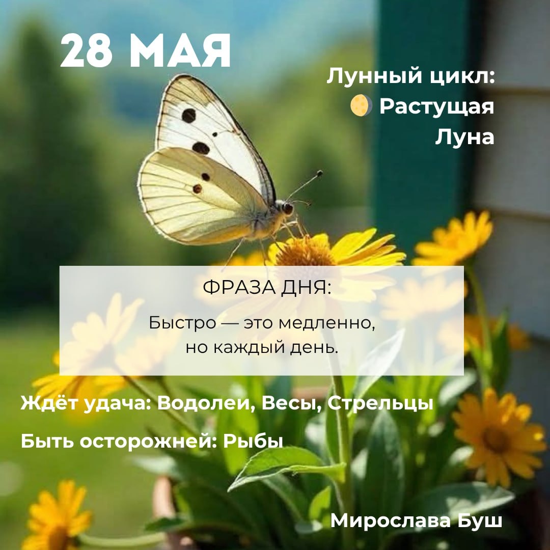 28 мая РЕКОМЕНДАЦИИ: 🤩 Благоприятный день, чтобы заняться своим здоровьем. Даже медитации и зарядка будут даваться легче и в радость. ☀️ Погода в этот день у наших предков считалась предвестницей летней — если 28 мая тепло, то и все лето будет жарким. Пишите завтра, какая у вас! 🧹 Смените пастельное белье и выбросите накопившийся хлам, чтобы привлечь удачу и деньги. ✉️ Подписаться на Мирославу #прогнознадень