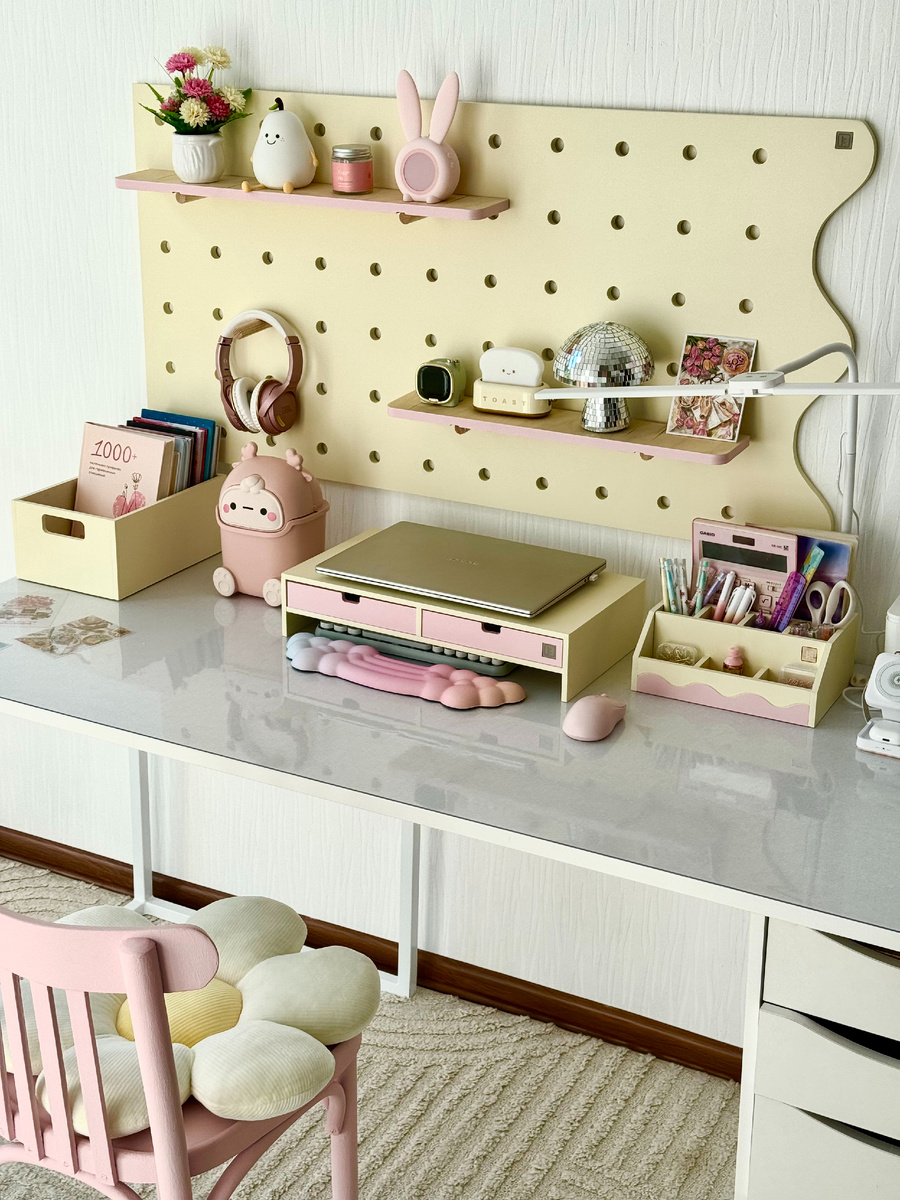 Я устала от оттенков сканди, тем более когда Pantone предлагает такие вкусные цвета. Оттенок сливочное масло можно сейчас увидеть практически у каждого бренда одежды. Но я пошла дальше и организовала в нежном сливочном цвете теплый и уютный уголок , идеально подходящий для комфортного и вдохновляющего рабочего места. Разбавила его немного сложным, но очень приятным оттенком розового. Да, я по-прежнему считаю пегборд прекрасным решением для использования полезного вертикального пространства перед столом. Здесь можно расположить, например, то, чем жалко занимать рабочую поверхность. Я люблю хранить на пегборде часы, декор, небольшие цветочные кашпо, фигурки и прочие мелочи, которые создают настроение и радуют глаз. Что же мы располагаем на рабочем столе? Конечно, подставку под ПК, прежде всего для правильного положения глаз перед монитором и здоровой осанки. В нее, кстати, прекрасно сложить, провода, флешки и другие полезные мелочи. Канцелярская подставка незаменимый помощник для вас