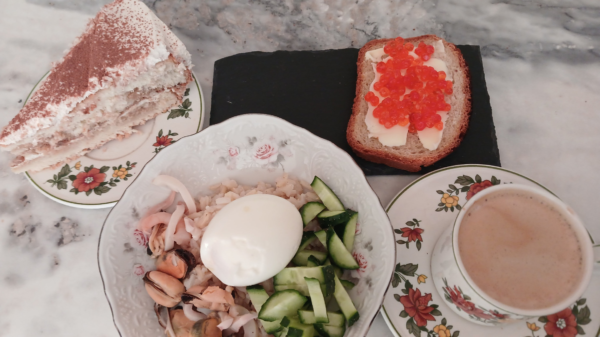 Сегодня завтрак почти такой же, как вчера: боул. Но наполнение у всех разное из того, что нашлось в холодильнике. К боулу бутерброды с икрой и торт Тирамису с кофе На обед доели оливье с говядиной, а потом было вот так 🤩 на ужин потушила куриную печенку в сметане, на гарнир - гречка и овощи Меню год назад