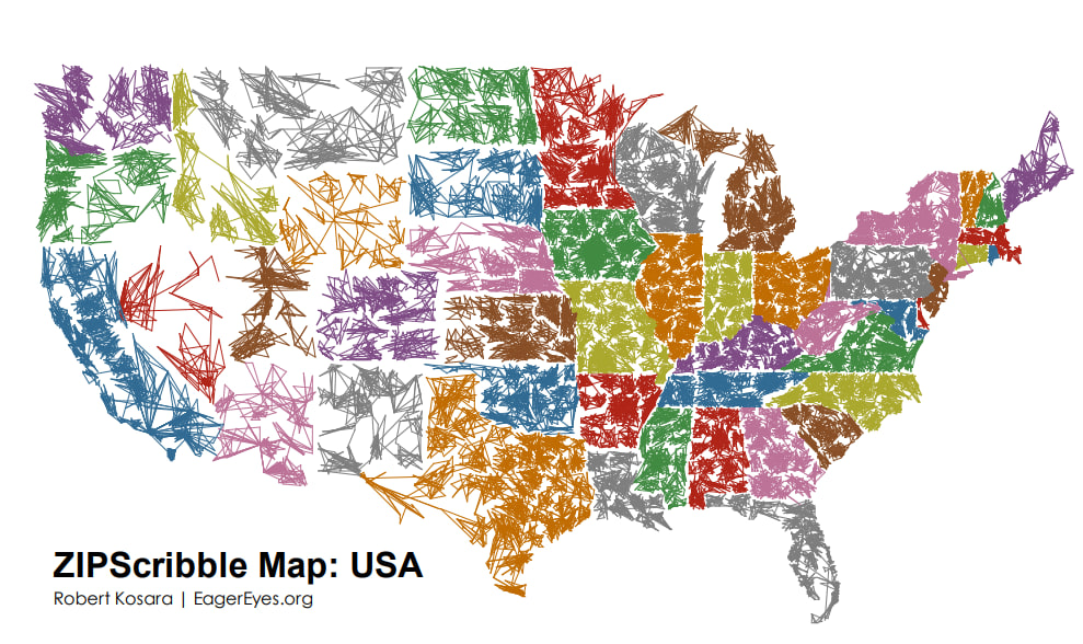 Почтовые индексы (ZIP-коды) существуют менее пятидесяти лет. Они появились не раньше 1963 года — этот факт даже позволяет историкам точно датировать события, вроде появления сериала "Беверли-Хиллз 90210", в названии которого фигурирует реальный ZIP-код. С тех пор индексы стали важной частью нашей жизни: они упорядочивают пространство, управляют потоками почты и помогают ориентироваться. Однако ZIP-коды не случайны. За ними стоит чёткая структура. Юбилей в 50 лет стал поводом взглянуть на индексы с новой стороны — с точки зрения математики и геометрии. ZIP-код можно рассматривать как способ разбить территорию страны на зоны. Каждая цифра в коде сужает область. Например, если ввести 64110 (это Канзас-Сити), можно увидеть, какие регионы США начинаются с цифры 6. Визуализацию такой структуры сделал Бен Фрай из студии Fathom в проекте zipdecode — по мере ввода цифр становится ясно, как индекс указывает местоположение. Но можно пойти глубже. Подумайте о ZIP-кодах как о кровеносной системе ст