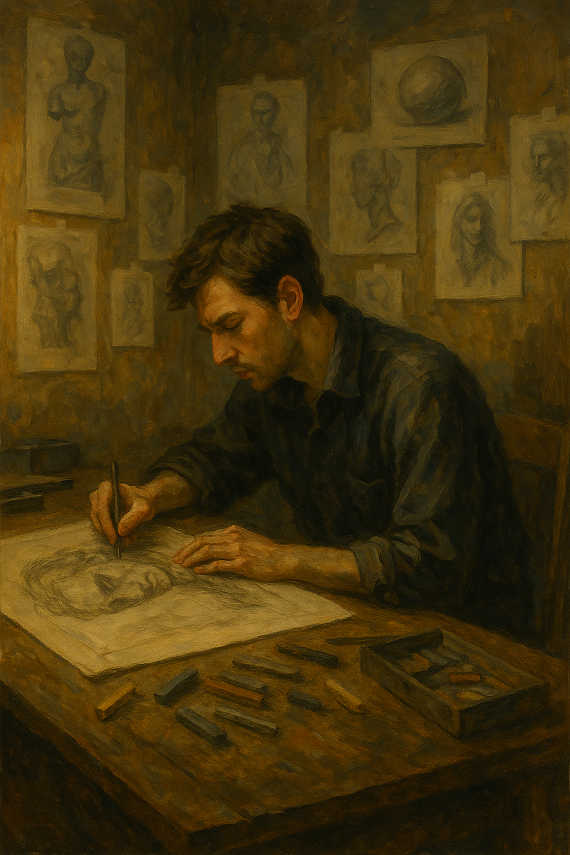 Ровно шесть месяцев — чтобы стать кем-то другим. Я составил себе список литературы. Подписался на курсы по рисунку. Купил материалы. Развесил на стенах распечатки чужих работ. Повесил таймер. Режим был жёсткий.