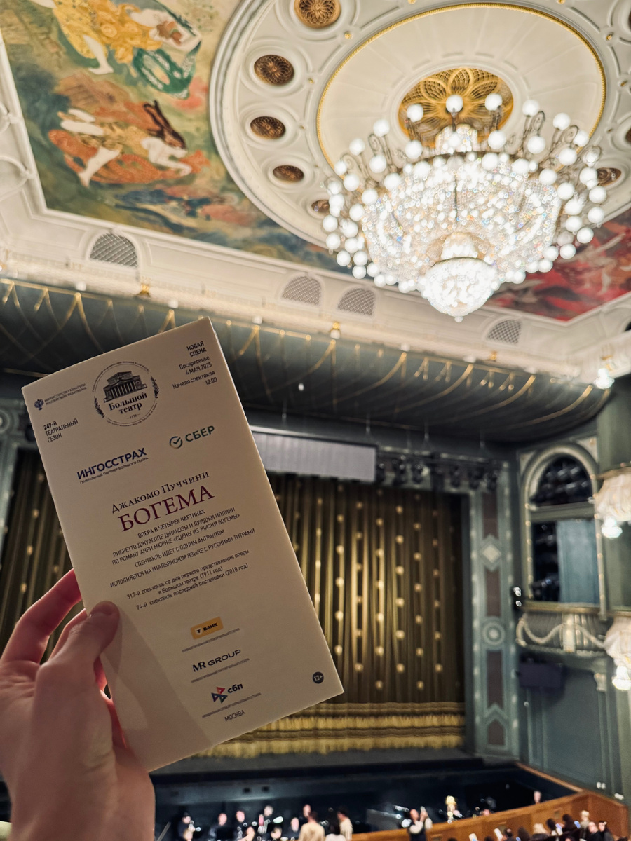 Иногда достаточно одного взгляда вверх — на потолок, на люстру, на фрески — чтобы понять: ты оказался в правильном месте. Театр способен не только рассказать историю, но и перенести в пространство, где время замедляется. Так было в тот воскресный полдень, когда Большой театр распахнул для меня свои двери ⚜️ Это был мой второй визит в московский театр — и вновь значимый. На этот раз не Театр Сатиры, как в прошлом году, а Новая сцена Большого. Не тот самый знаменитый зал в золоте и бархате, но его соседка — более сдержанная, будто капсула, где позолота уступает место хрустальной точности. Стекло, вензеля и глянец — другая эстетика, другая тишина 🕯️ Начало в 12:00. Не вечер, не антракт с вином под абажуром — а дневной свет, проникающий в коридоры, как будто сам город пришёл поглядеть, что здесь поют. Это вносило лепту в восприятие: день разворачивался не вокруг тебя, а в тебе, с тобой ☀️ Бельэтаж, первый ряд — безукоризненно. Передо мной — только сцена, на субтитры не надо задирать г