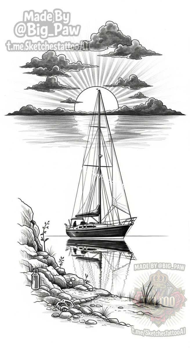 #2460 Подборка по запросу подписчика - черно-белый вертикальный Закат и ниже яхта и берег 🧠 SYNTX 💳 Донат 😎 НейроБро 💀 Эскизы от нейросети #яхта #реализм #природа #эскизы #тату #татуировки