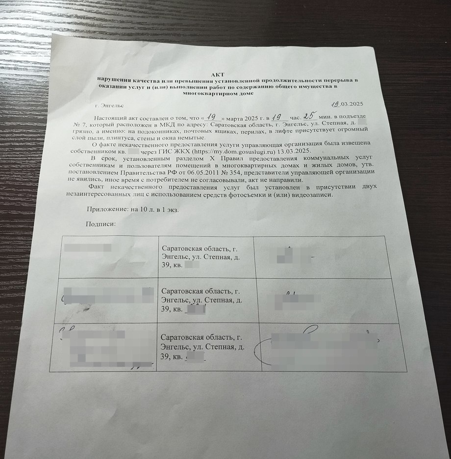 Встречаются дома, в которых жители делают акт и направляют заявление на перерасчет в УО. Члены совета в свою очередь по непонятным причинам (возможно, что-то им обещают в УО) сразу же на следующий день без собственников, направивших заявление на перерасчет, но в присутствии представителей УО составляют и подписывают акт, в котором чудесным образом указано, что в подъезде все чисто и хорошо, а придомовая территория в удовлетворительном состоянии и не требует уборки.