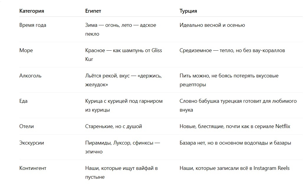 Египет — это как советская комната отдыха: немного облуплено, но душевно. Приезжаешь, и сразу в лицо: жара, ветер с пустыни, водка, от которой можно заправить УАЗик, и улыбчивый Ахмед, который за 10 баксов организует экскурсию на верблюде и подбросит пирамиду из песка в подарок. Турция — это курортная любовь с первого «мерхаба». Всё включено, персонал обучен с детства радовать уставшего русского туриста, отель как конфетка, а аниматоры веселятся, будто им обещали наследство от Билла Гейтса, если они заставят тебя танцевать макарену. 🌍 В общем, выбирай, где тебе больше по душе: песок и фараоны или рафаэлки и хамам. И помни: где бы ты ни отдыхал — главное, не брать в ручную кладь арбуз и мангал.
